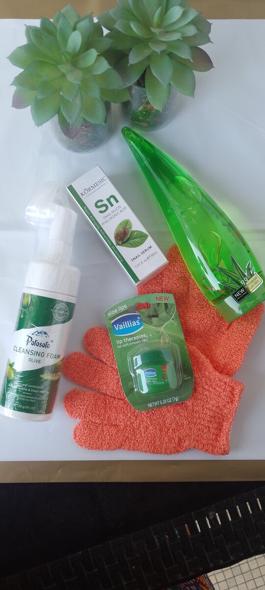 Mousse lavante, sérum anti âge ,gants gel hydratant à l'aloé vera et baume à lèvre pour un soin basique mais efficace.