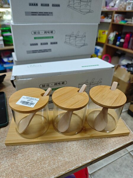 Новый набор для хранения специй . В комплекте 3 баночки с деревянной крышечкой и ложечкой.