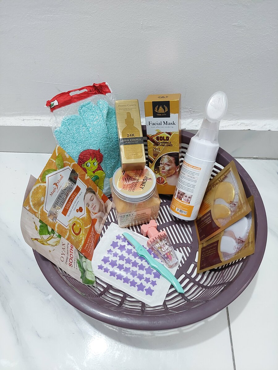 Kit complet pour soins du visage et du corps à domicile. Inclut masques faciaux en or 24K, exfoliants, brosse de nettoyage et plus pour une peau éclatante et revitalisée. Idéal pour un spa personnel.