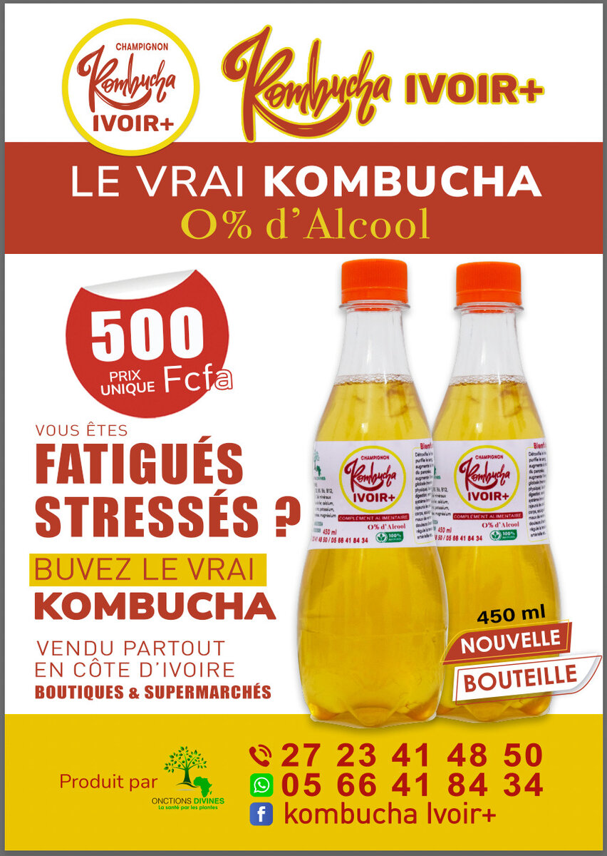 Découvrez Kombucha Ivoir+, boisson rafraîchissante sans alcool. Idéale pour réduire le stress et revitaliser votre journée. Parfait pour tous vos moments de détente!