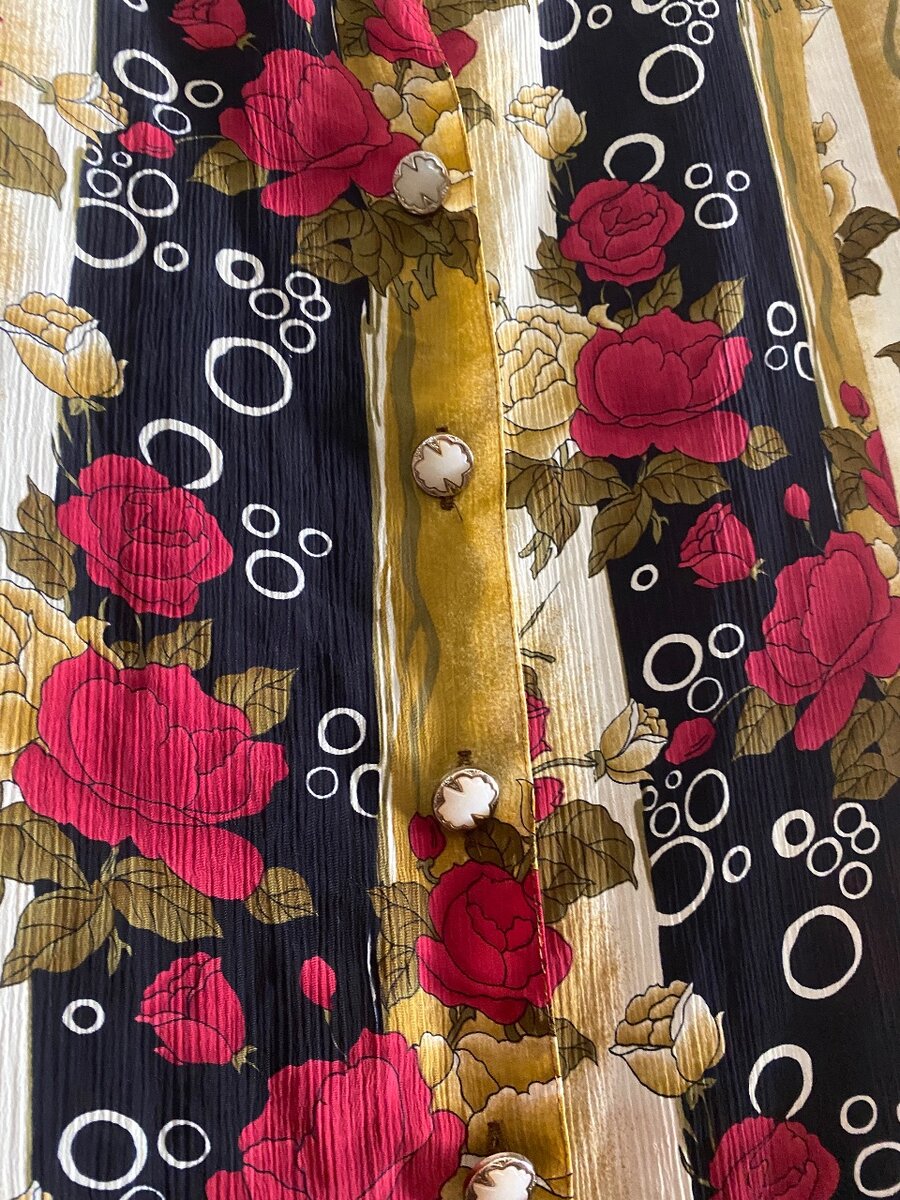 Robe fleurie, avec des boutons dorés. Ça sort forcément
