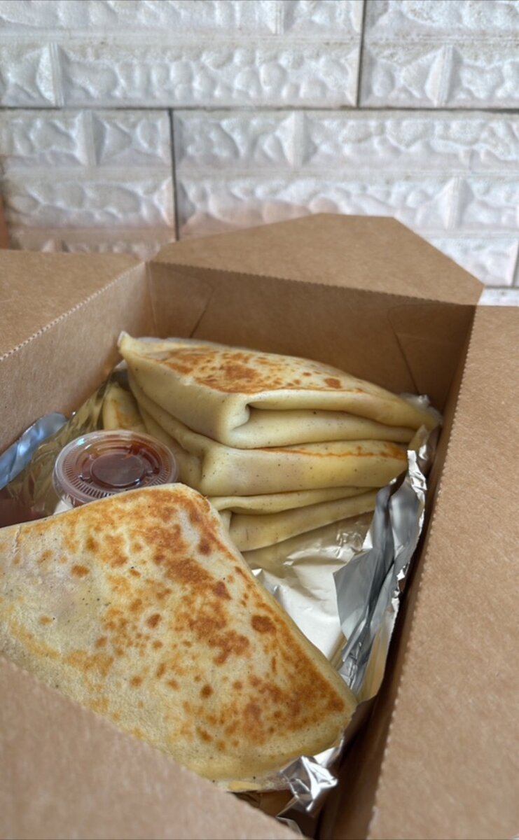 06 crêpes de 24 cm avec garniture au jambon de bœuf, fromage et sauce béchamel , plus un supplément pot de sauce.