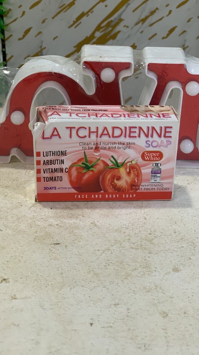 Savon de beauté La Tchadienne enrichi en glutathione, arbutine et vitamine C. Éclaircit et hydrate la peau, idéal pour le visage et le corps. Parfait pour une peau lumineuse et éclatante, avec des extraits de tomate pour une utilisation quotidienne.