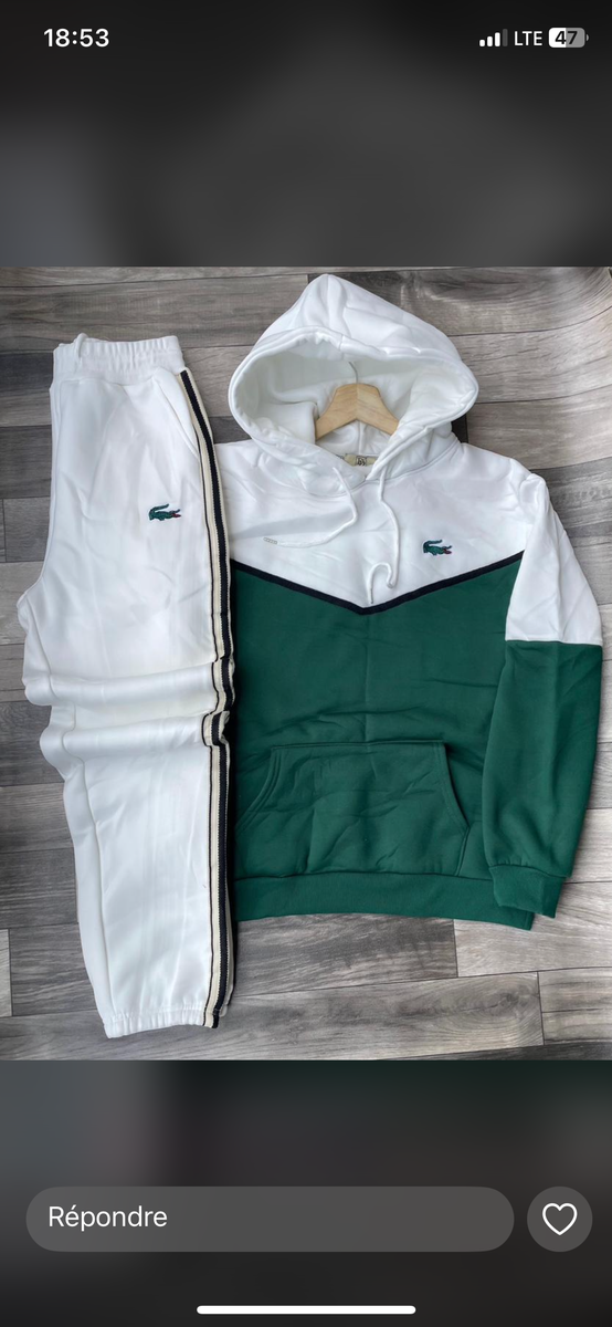 Ensemble Lacoste pour homme comprenant un sweat à capuche et un pantalon assorti. Conçu pour le confort et la performance.