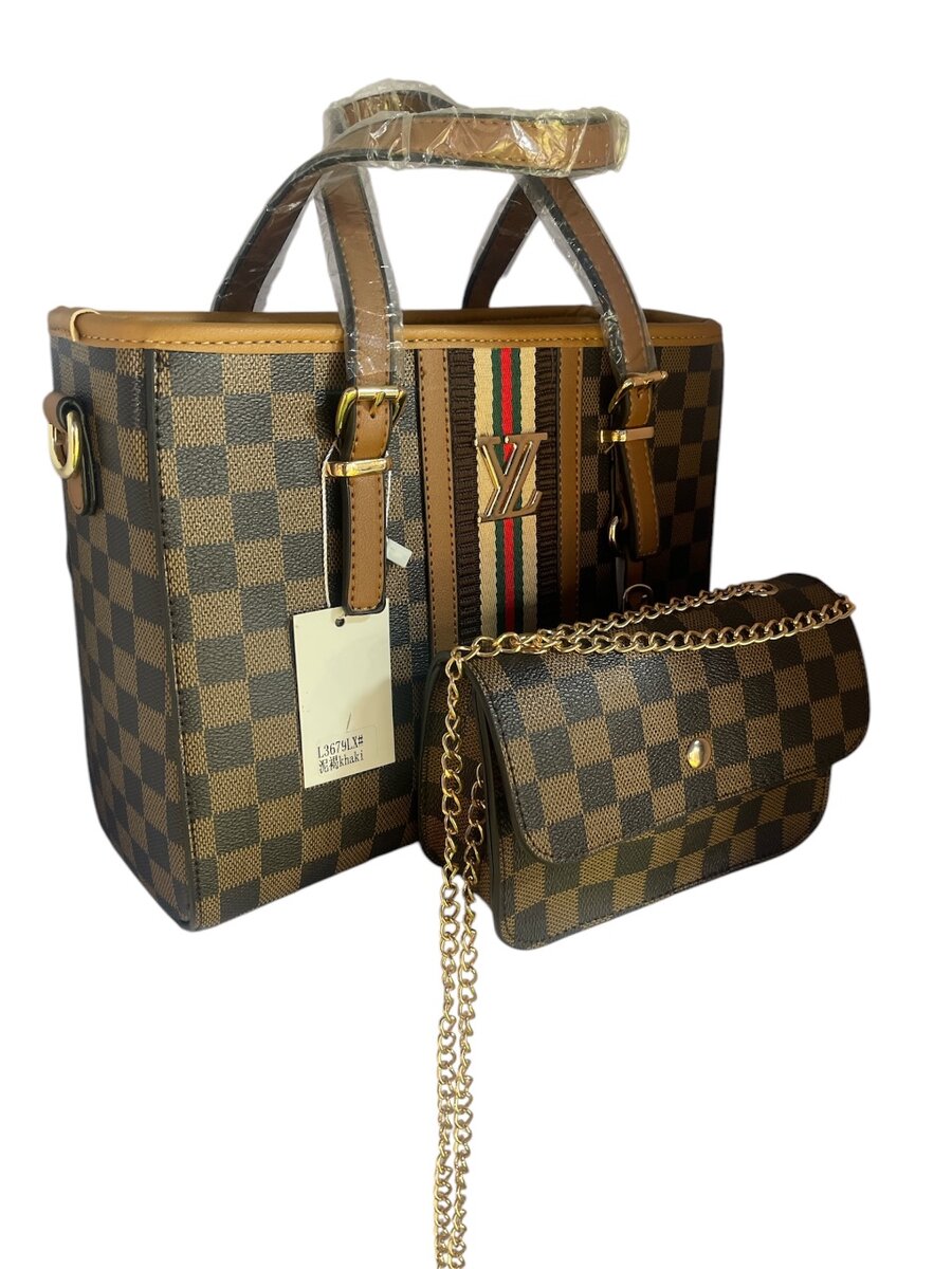 2.Small Shoulder Bag: Matching design with checkered brown and tan pattern, flap closure, and gold button. Attached to the tote by a gold chain for convenience and style.