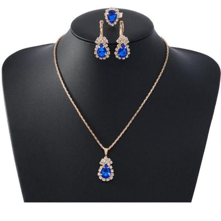 Name: 3pcs/set Teardrop-Shaped Necklace Earrings Ring Set Style: Fashion Color: silver blue Size: necklace length 42cm, earring length 4cm, width 1.8cm, ring diameter 1.7cm