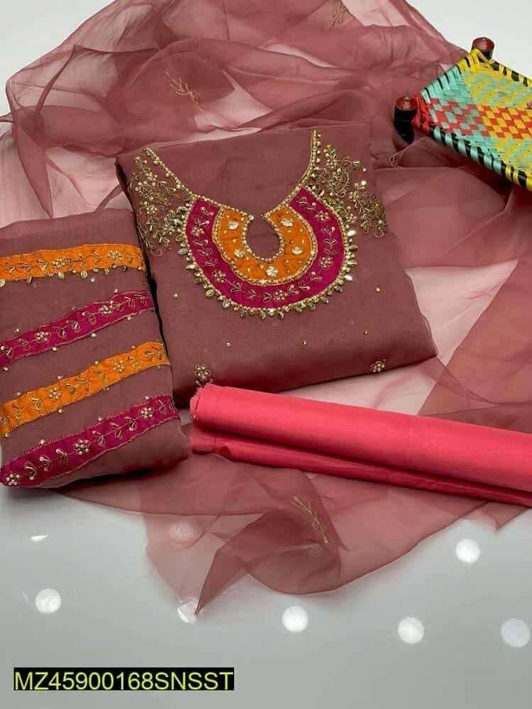 3 pcs women's unstitched organza mirror work suit