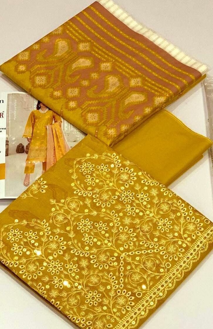 Fabric Lawn Printed Embroidery With Boring Daman Shirt Slevees Boring Embroidery Back Printed Digital Printed Fancy zarri Voil lawn Duppata Dyed lawn Trouser Stuff N Colors Garenty Beautiful Color's Scheme OutClass Fabrics.