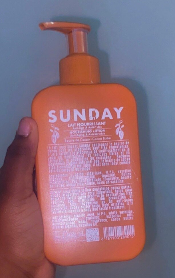 Découvrez le lait nourrissant Sunday, enrichi en beurre de cacao pour une peau douce et hydratée. Anti-âge et anti-rides, idéal pour un soin quotidien. Format pratique de 350ml.