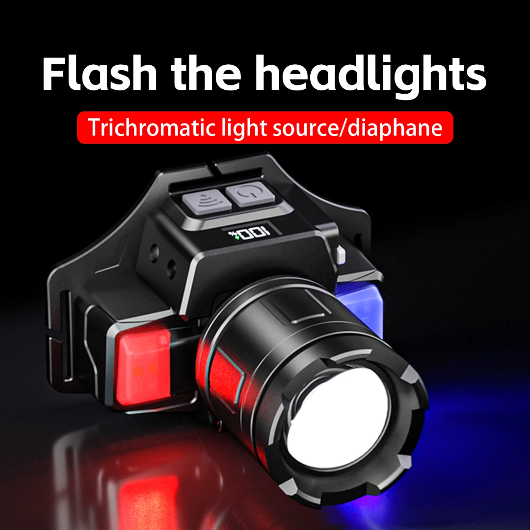 Optimisez vos aventures avec cette lampe frontale à induction intelligente et USB. Rotation 90° et lumière trichromatique pour un éclairage parfait. Idéale pour le camping, les randonnées ou le travail en extérieur. Batterie lithium à haute capacité pour une illumination durable. Prête à l'emploi partout, à tout moment!