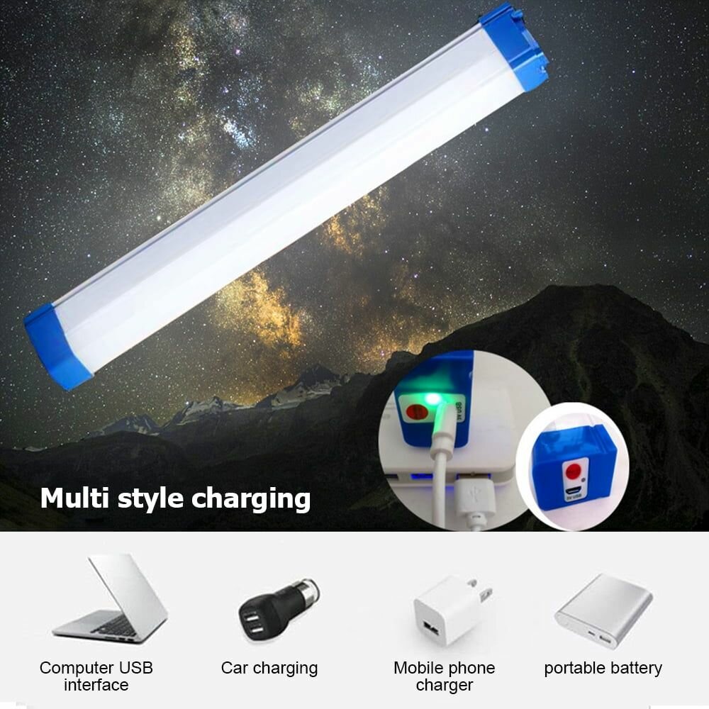 Lampe LED rechargeable idéale pour le camping avec 3 niveaux de luminosité. Facile à charger via USB, voiture ou batterie portable. Parfaite pour une utilisation en extérieur ou en cas de panne de courant.