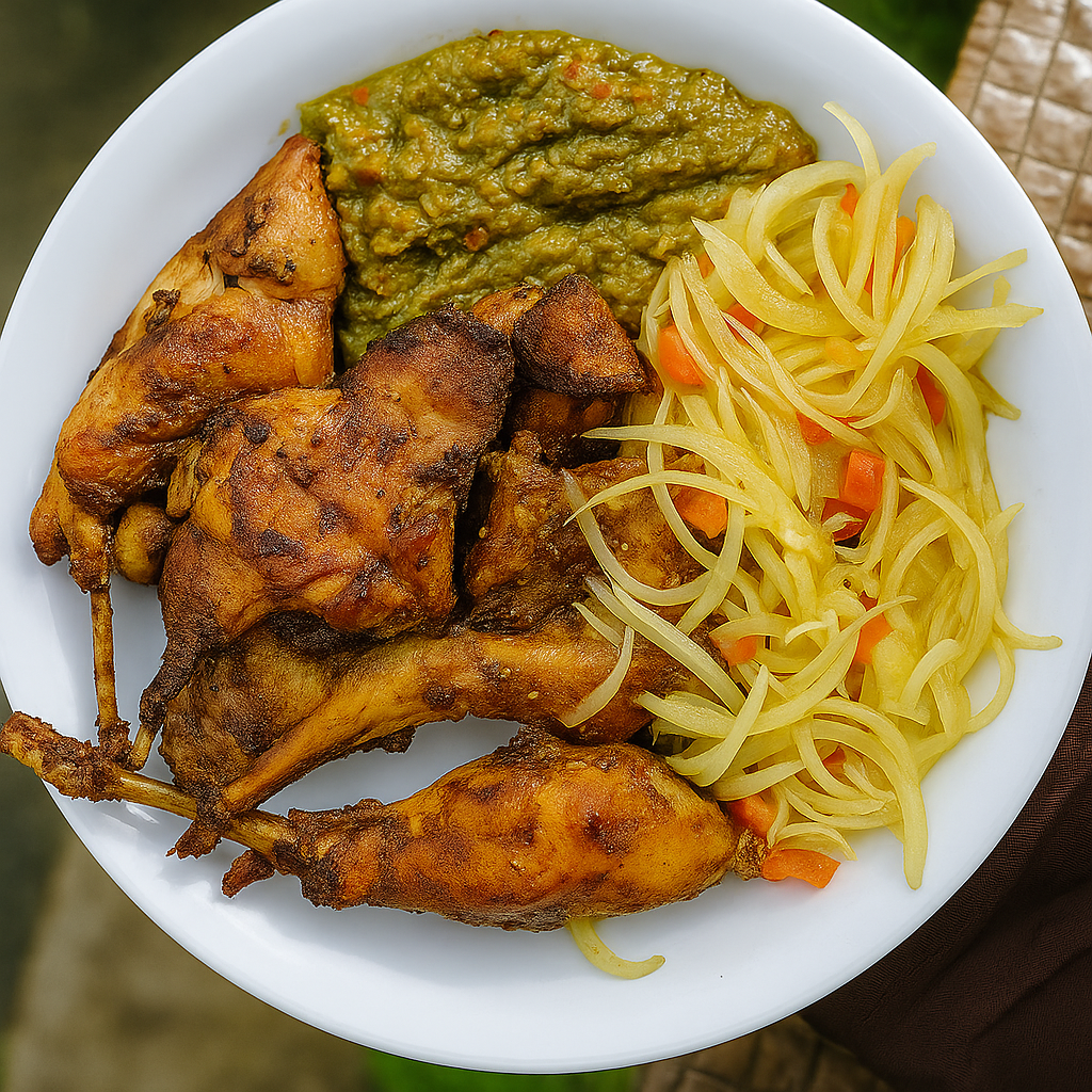Délicieux lapin grillé avec attieké, piment et condiments découpés