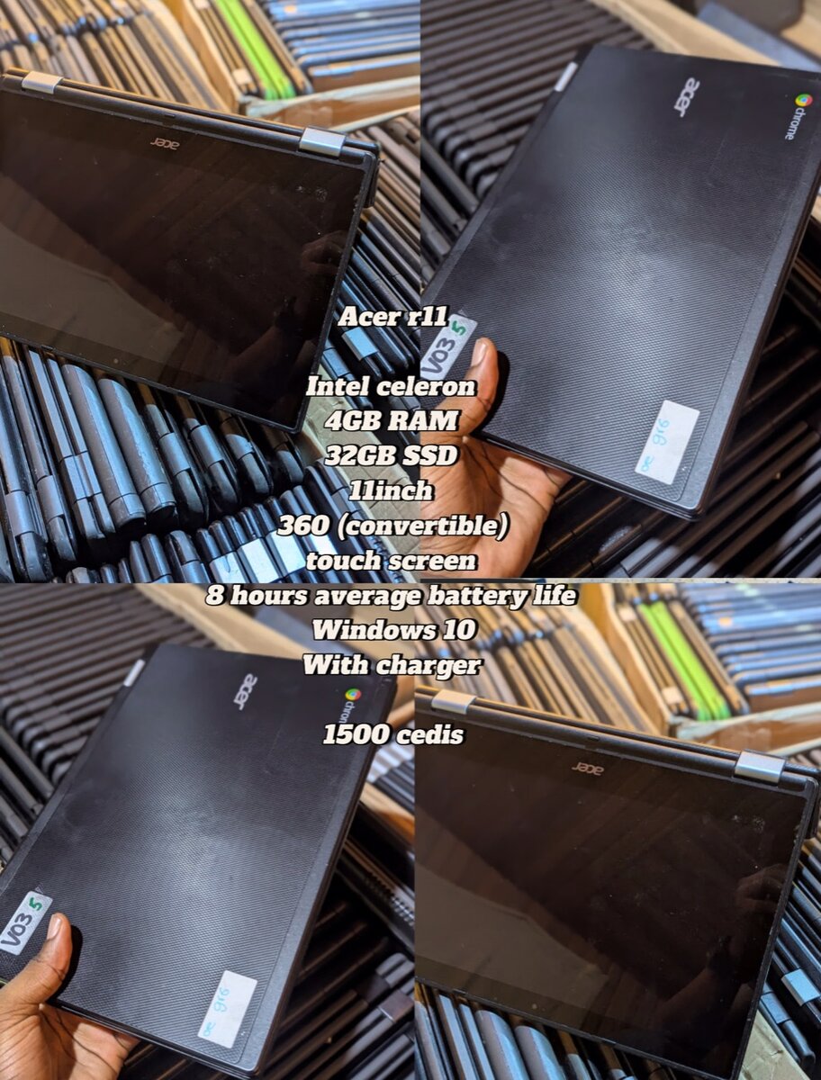 Acer r11 Intel celeron 4GB RAM 32GB SSD 11inch 360 touch 8 hours average battery life Windows 10 With charger