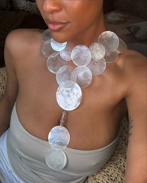 Large statement necklace featuring oversized disc-shaped shells, perfect to make any outfit pop. Modern, bold and lightweight for stylish women who like a unique accessory. Ideal for parties or fashion events.
