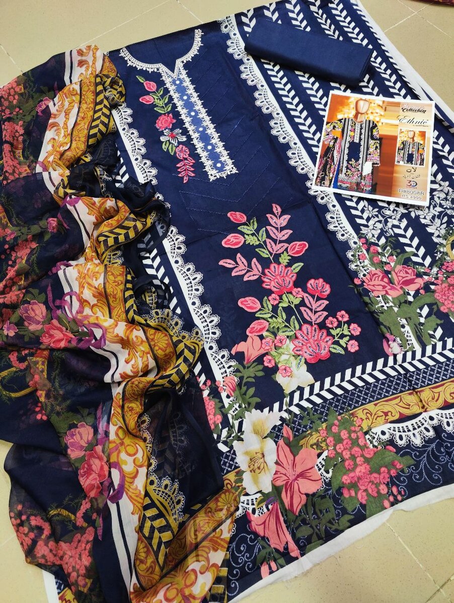Lawn embroidered shirt, Lawn plain dyed trouser, Lawn digital printed duppata, Available in all sizes