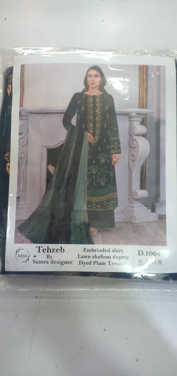 Lawn Embroidered shirt, Lawn Shafoon Duppata, Dyed Plain trouser