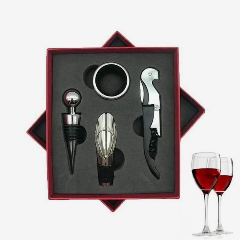 C'est un coffret qu'on peut offrir à un collègue, un ami, son époux ou son épouse un parent, il a en son sein 5 cadeaux qui chacune permettent d'ouvrir, servir, maintenant la température, éviter de verser en servant et sert aussi a decapsuler les bouteilles. Il se présente en coffret de couleur rouge et coffret noir