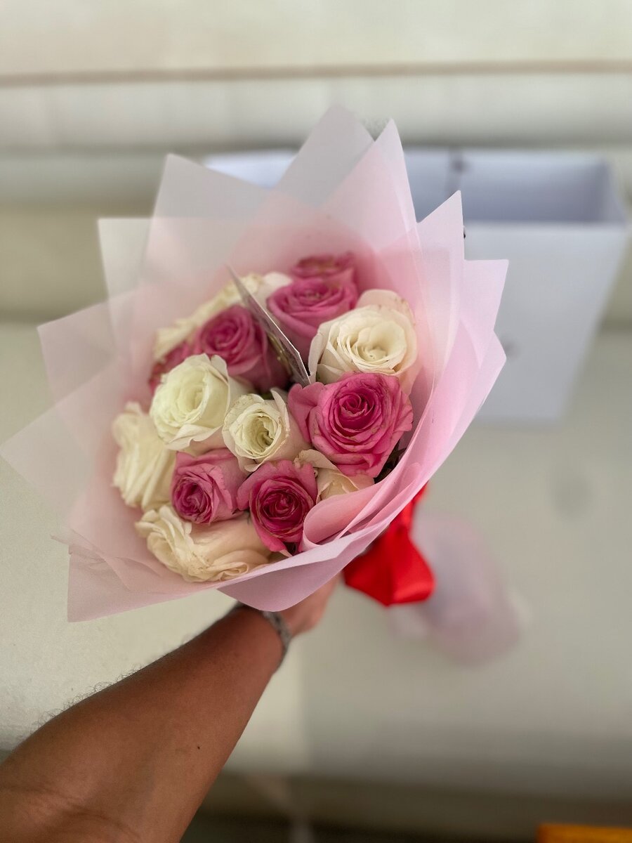 Bouquet de roses naturelles blanches et roses.