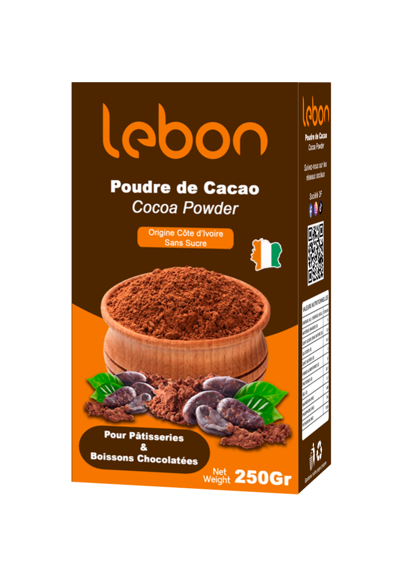 Découvrez la poudre de cacao Lebon, origine Côte d'Ivoire, parfaite pour pâtisseries et boissons chocolatées. Sans sucre et de haute qualité, elle ravira vos sens.