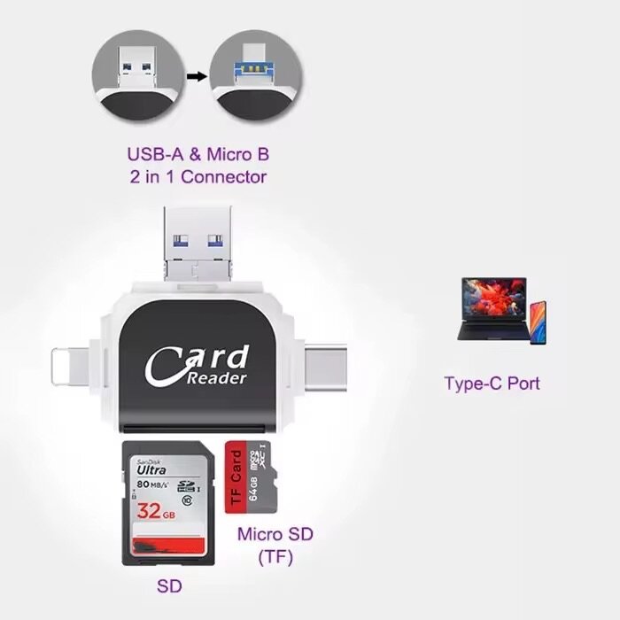 Lecteur de carte multifonctionnel avec connecteurs USB, Micro B et Type-C. Prise en charge des cartes SD et micro SD pour un transfert rapide et facile de vos données. Compatible avec ordinateurs, smartphones et tablettes. Idéal pour les professionnels et les utilisateurs en déplacement.