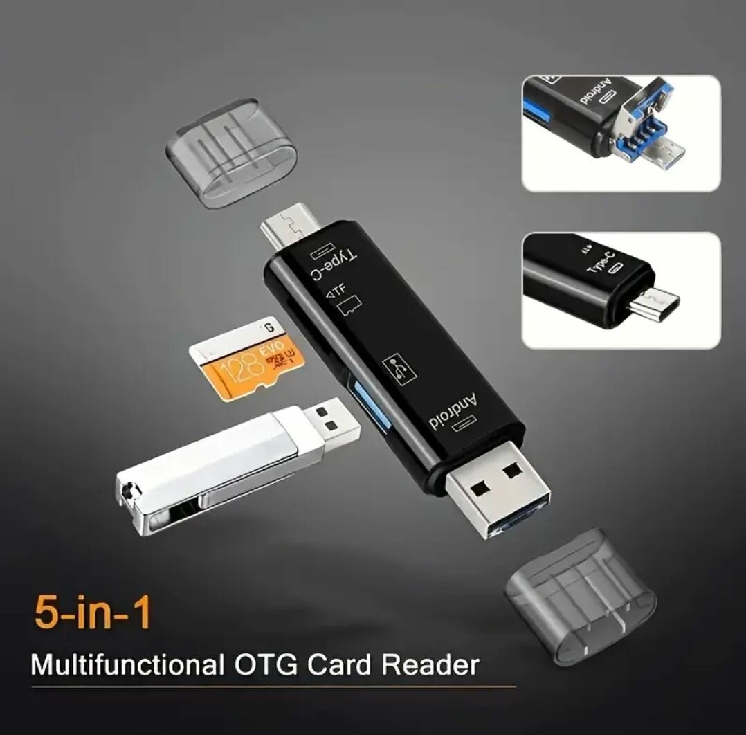 Lecteur de carte multifonctionnel avec connecteurs USB, USB-C et Micro USB. Compatible Android, idéal pour transferts rapides. Pratique pour clavier, souris, clés USB.