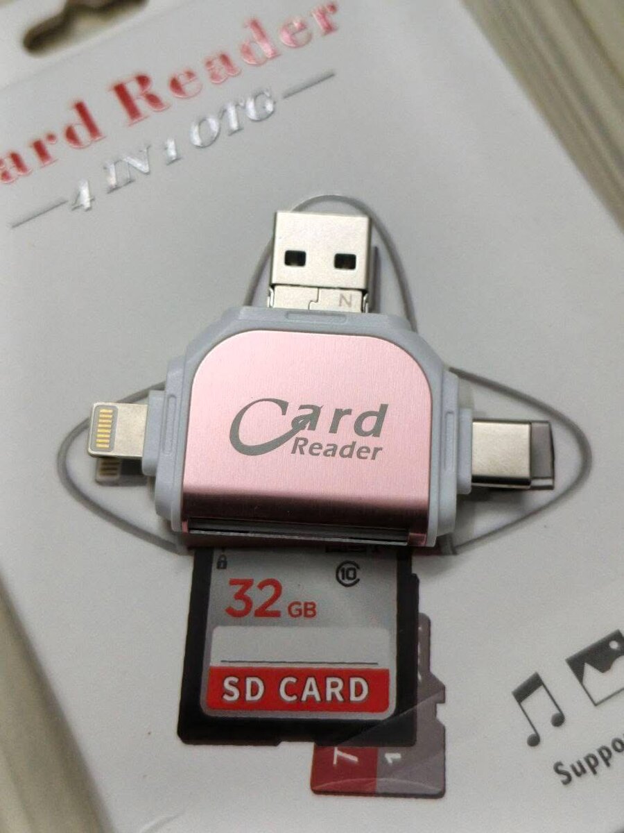 Lecteur de carte mémoire 4 en 1 compatible avec les téléphones Android et les ordinateurs. Transfert de fichiers rapide et facile. Capacité de lecture de carte SD, micro SD, USB et Lightning. Idéal pour libérer de l'espace de stockage sur votre téléphone ou pour partager des fichiers.