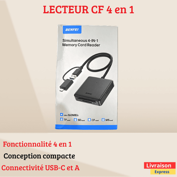 Lecteur de cartes 4 en 1 compact avec connectivité USB-C et USB-A. Idéal pour lire des cartes TF, SD, CF et MS à haute vitesse. Parfait pour les photographes et les voyageurs.