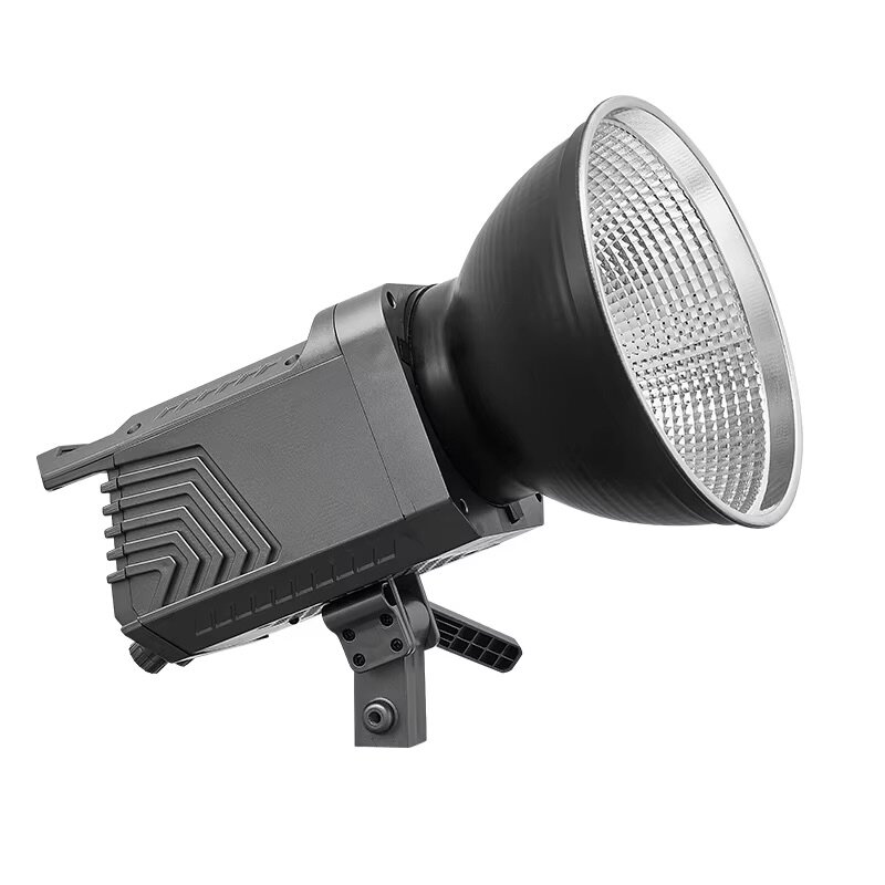 Professional LED video spotlight with wireless remote control and knob adjustment. Adjust brightness and color temperature. Ideal for photography and videography.