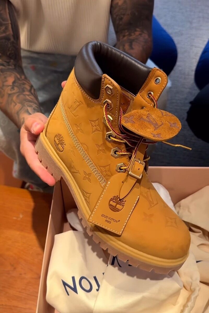 Elles fusionnent l'emblématique silhouette Timberland avec des détails Louis Vuitton, notamment :