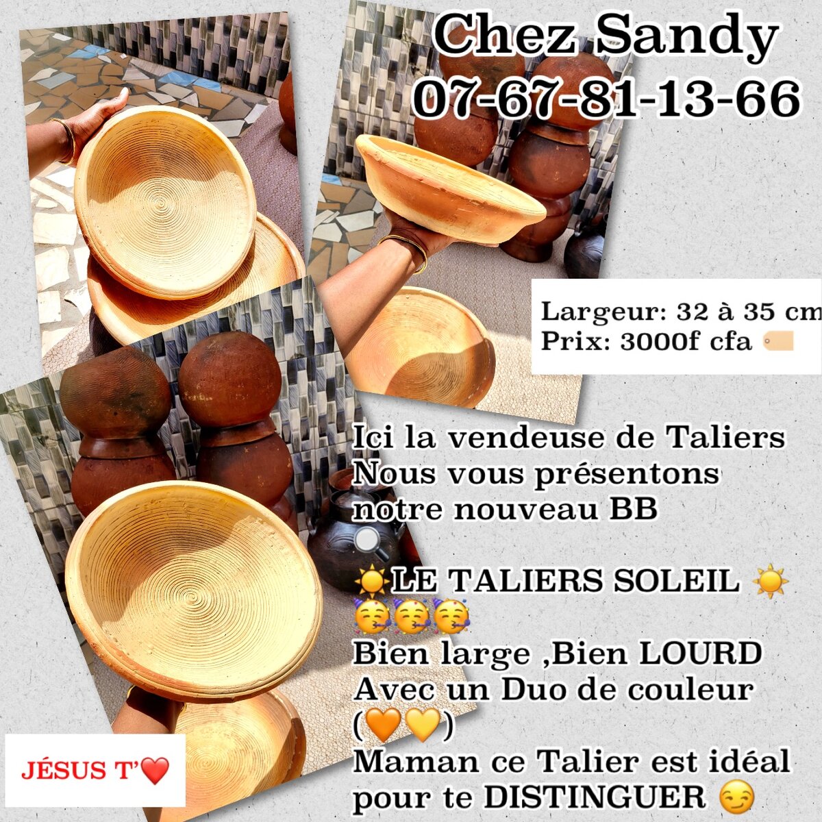 Ic chez Sandy la vendeuse de Taliers Tous types d ustensiles en terre Cuite mon combat: TALIERS,Soupière(qui passent au feu et au four,CANARI DE KEDJENOU