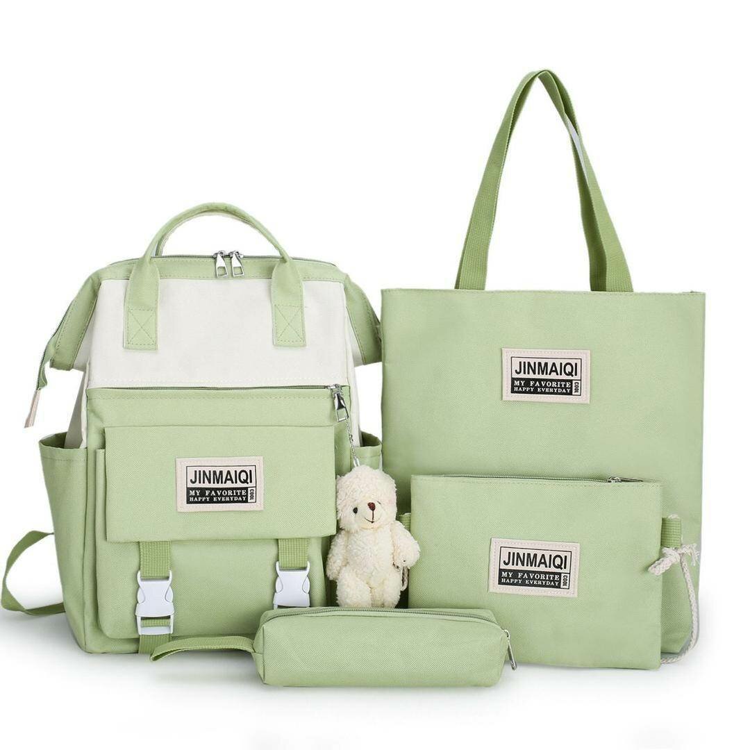 libelyef 4Pcs Canvas School Backpack Combo Set with Kawaii Teddy Bear Pendant Handle Shoulder Bag Laptop School Bag for Students with Backpack, Handbag, Pencil Bag, Shoulder Bag
