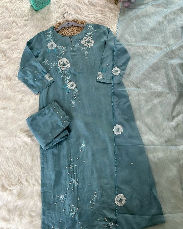 Linen Embroidered Shirt, Linen Plain dyed Trouser, Linen Embroidery Duppata...