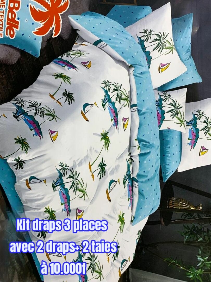 Nous vendons des draps 3 places 100% coton en gros et en détails avec de très beaux motifs . Il y a 2 draps+ 2 taies à l'intérieur