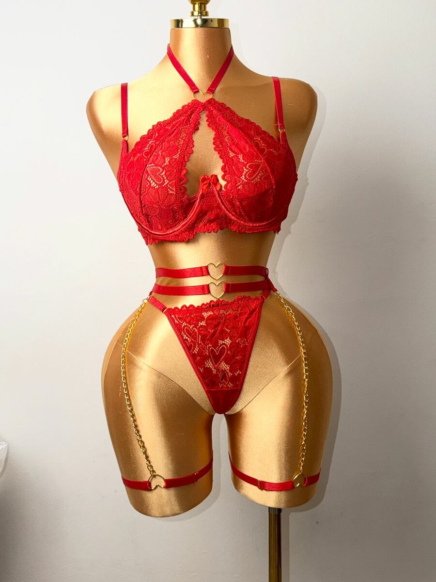 Découvrez ce lingerie en dentelle rouge flamboyant, parfait pour une soirée spéciale. Avec ses détails délicats et sa coupe séduisante, il est conçu pour offrir confort et élégance. Idéal pour faire chavirer les cœurs, ce modèle se distingue par ses chaînes dorées qui ajoutent une touche luxueuse.