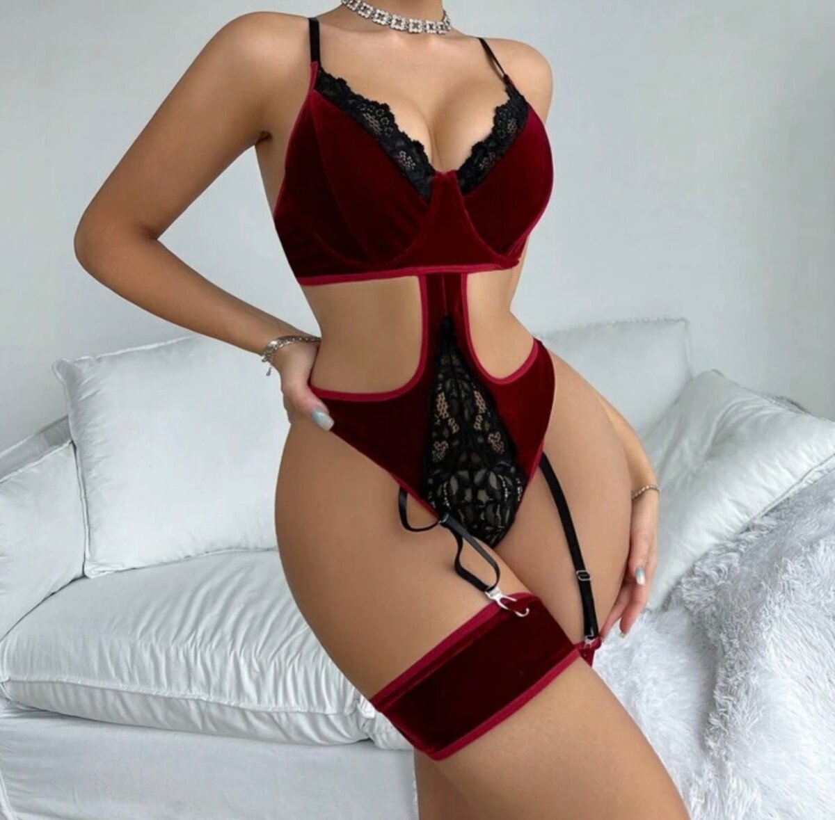 Découvrez ce magnifique ensemble de lingerie en velours bordeaux avec détails en dentelle noire. Parfait pour séduire et se sentir confiante. Taille ajustable pour un confort optimal. Idéal pour des moments spéciaux.
