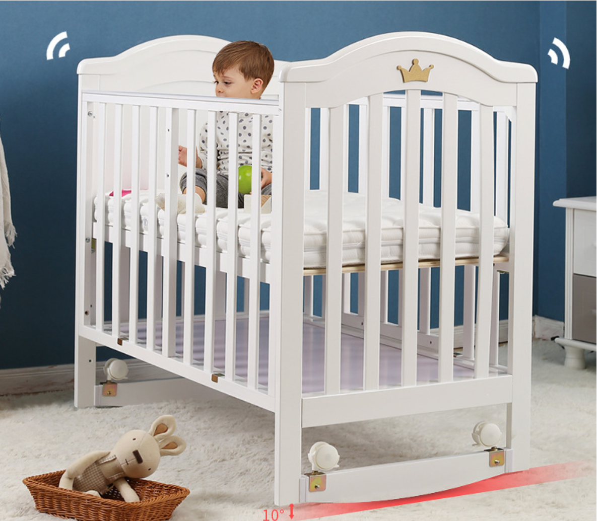 Lit bébé en bois blanc avec couronne dorée, design élégant et sûr pour votre enfant. Parfait pour une chambre de bébé moderne.