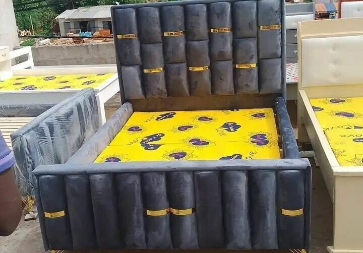 Lit moderne gris foncé avec tête de lit capitonnée. Conçu pour un confort optimal, il est idéal pour une chambre à coucher élégante. Fabriqué avec des matériaux de qualité, il offre un soutien ferme et durable. Parfait pour les amateurs de design contemporain.