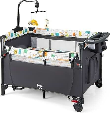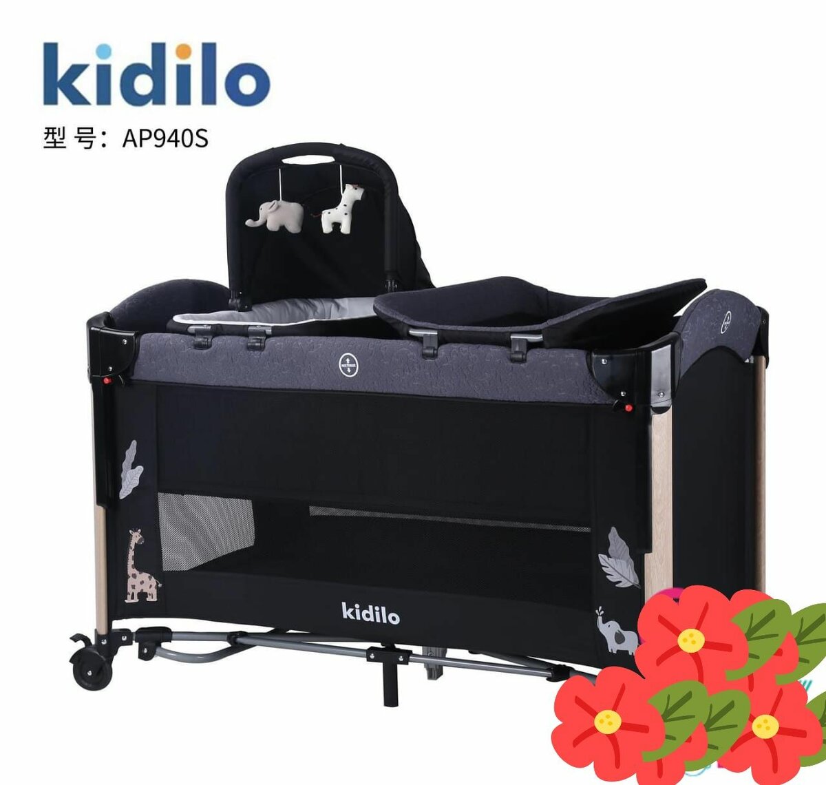 Lit de voyage bébé Kidilo AP940S : pratique, sûr et confortable. Idéal pour les déplacements, il offre un espace de sommeil douillet pour votre enfant. Design élégant avec motifs d'animaux, facile à monter et transporter grâce à ses roues intégrées. Parfait pour la maison ou en déplacement !
