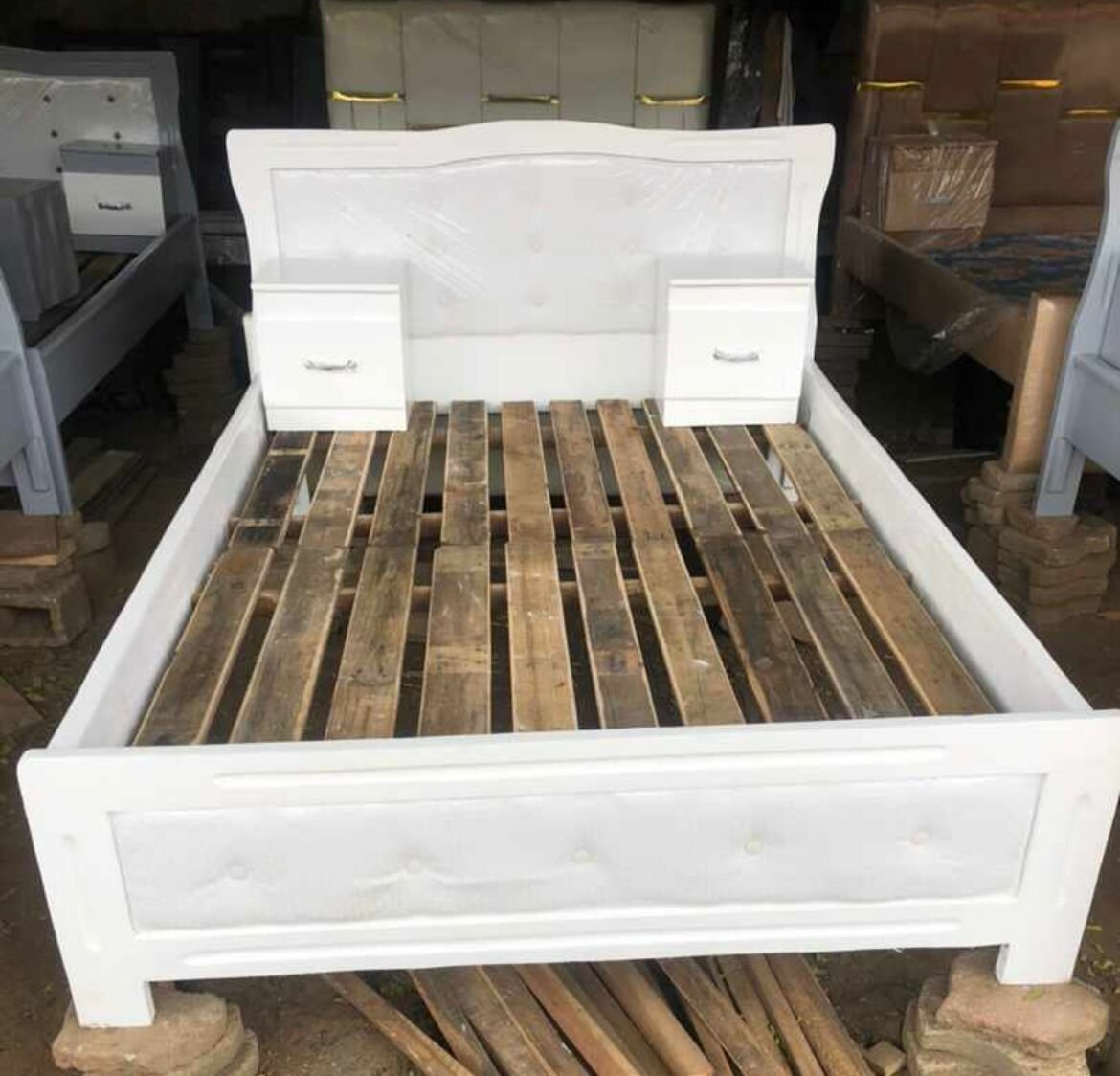 Lit double blanc avec tête de lit et rangements intégrés. Parfait pour une chambre moderne et fonctionnelle.