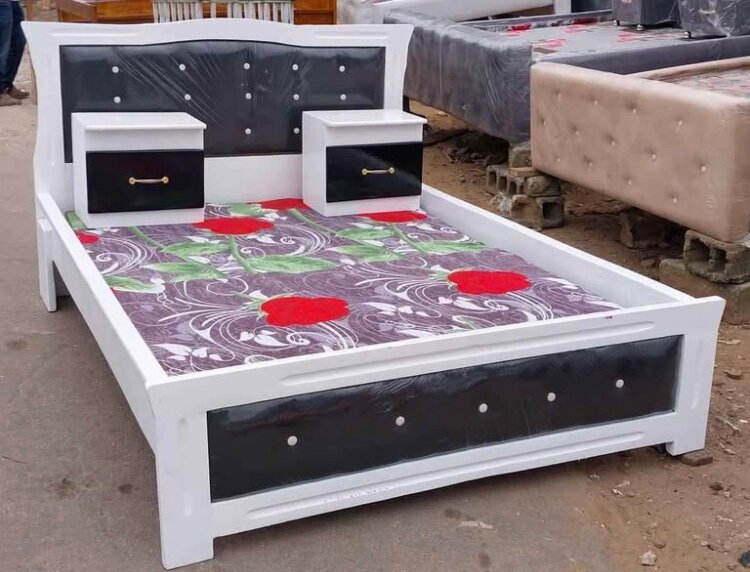 Lit double moderne avec tête de lit capitonnée et chevets intégrés. Rangement sous le lit et poignées en or. Idéal pour la chambre à coucher.
