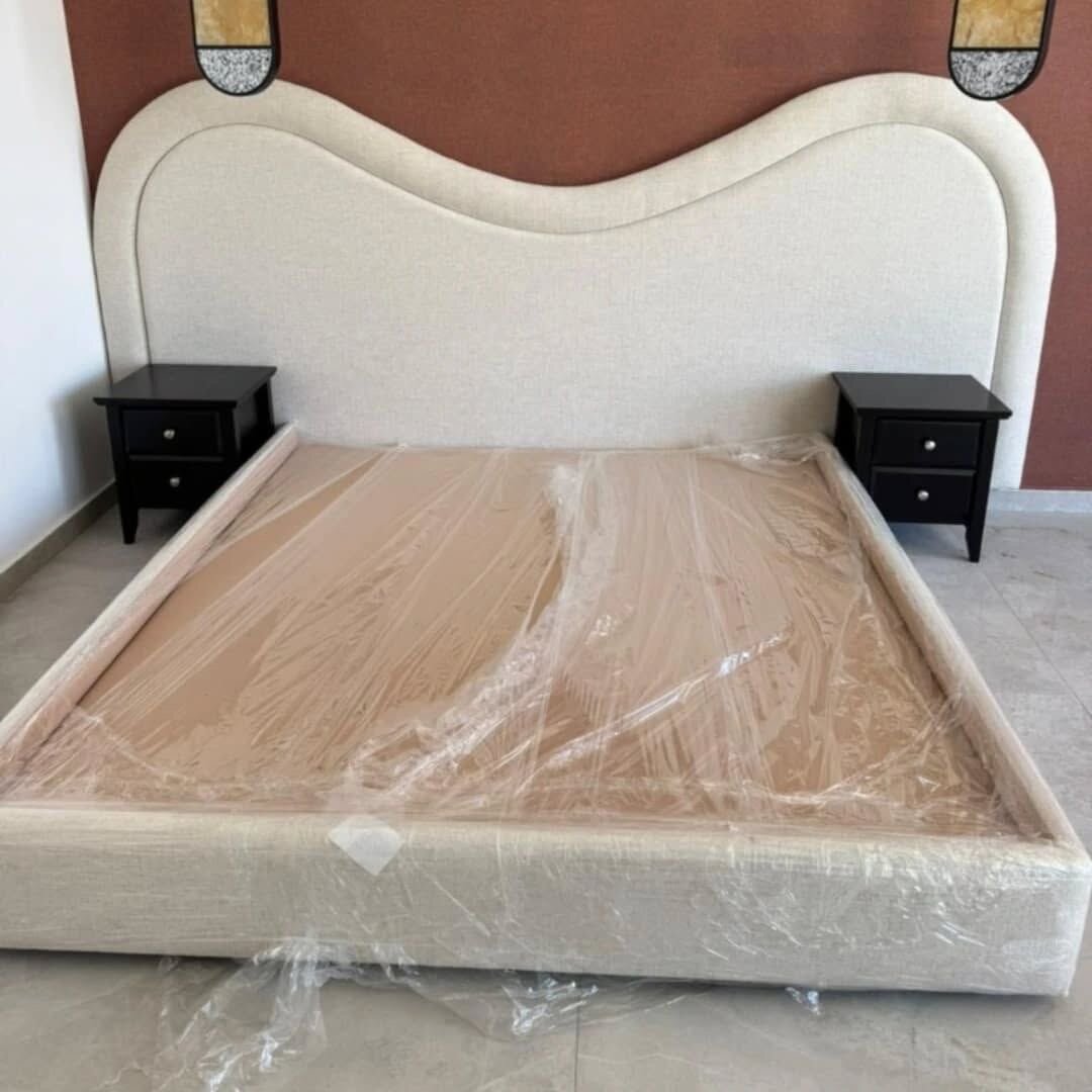 Lit double capitonné avec tête de lit en tissu beige. Parfait pour une chambre moderne, il offre un confort et un style incomparables. Disponible sans matelas.