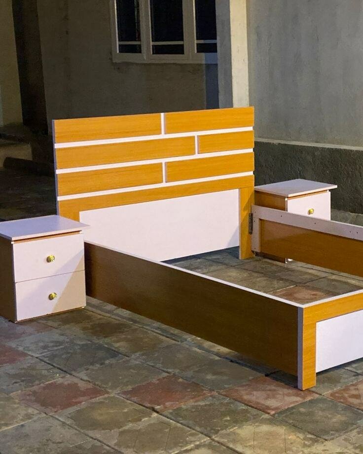 Lit double moderne en bois avec panneaux tête de lit et chevets. Design élégant et pratique. Facile à assembler, idéal pour chambre à coucher.