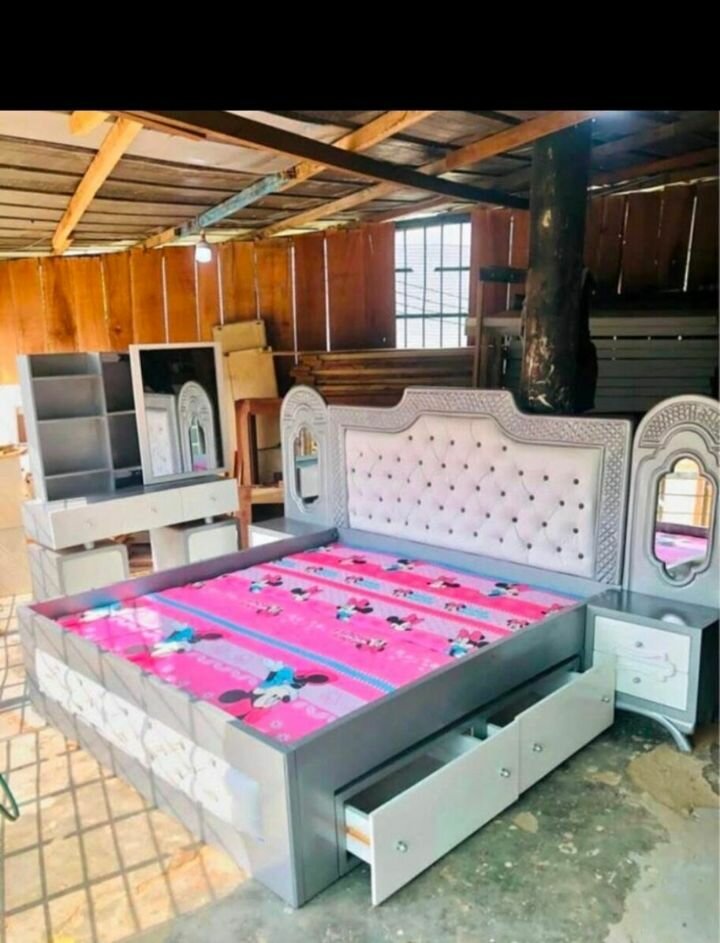 Lit double élégant avec tête de lit capitonnée et rangements intégrés. Conçu pour un confort optimal et un design moderne. Parfait pour chambre à coucher contemporaine.