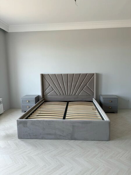 Élégant lit double avec tête de lit capitonnée pour un confort optimal. Structure robuste en bois massif, idéale pour une chambre moderne. Parfait pour ajouter une touche de luxe à votre sommeil.