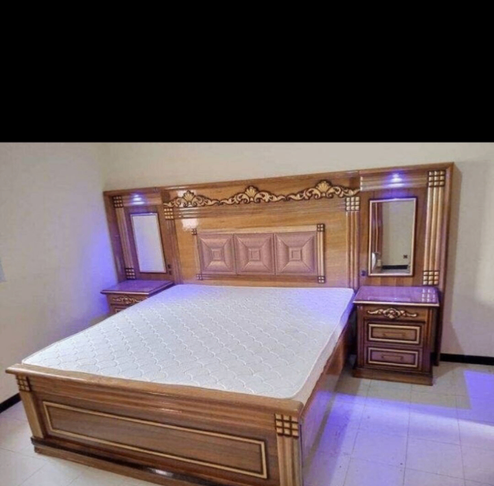 Lit en bois massif avec tête de lit sculptée, matelas inclus. Comprend deux chevets avec miroirs et rangements. Design élégant et robuste.