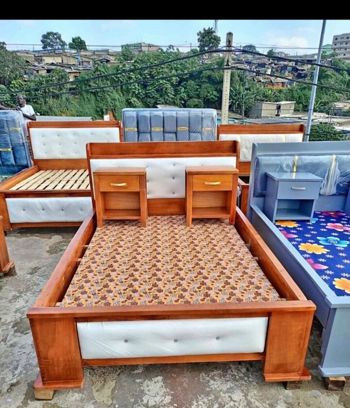 Lit en bois avec tête de lit capitonnée, parfait pour une chambre moderne. Conçu pour le confort et la durabilité, ce lit est idéal pour créer une atmosphère paisible et élégante dans votre espace de sommeil.