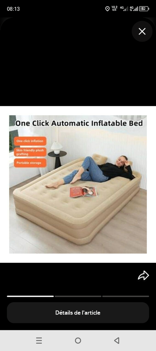 Découvrez le confort du lit gonflable automatique, idéal pour les invités ou le camping. Facile à utiliser avec son système de gonflage en un clic, ce lit simple est parfait pour un sommeil réparateur. Compact et portable, il se range facilement après utilisation. Dimensions : 190x100x40 cm.