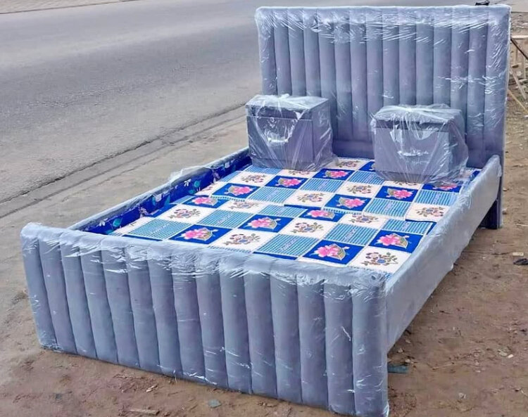 Lit moderne gris avec matelas et deux chevets inclus, housse de protection. Idéal pour une chambre adulte, confortable et élégant.
