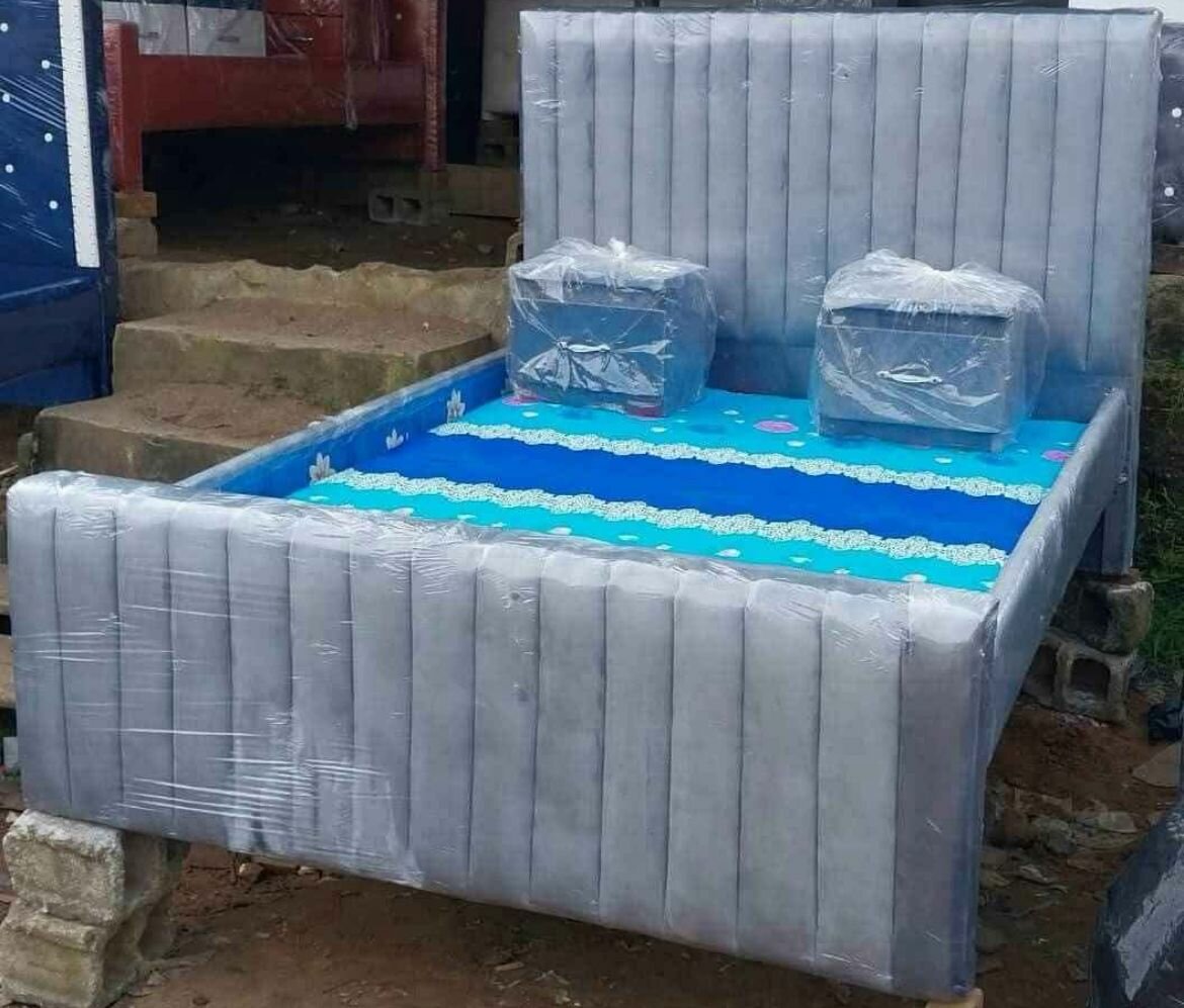 Lit moderne gris avec tête de lit rembourrée et matelas inclus. Design élégant et confortable, idéal pour une chambre à coucher contemporaine. Facile à assembler et durable.