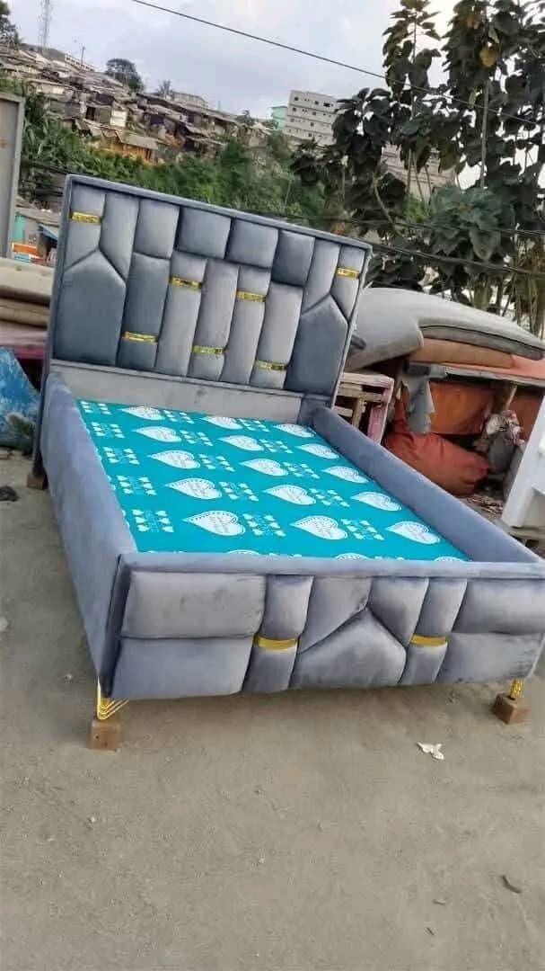 Lit gris confortable avec tête de lit capitonnée et matelas inclus. Design élégant et moderne, parfait pour une chambre à coucher. Confortable et durable, idéal pour un bon sommeil.